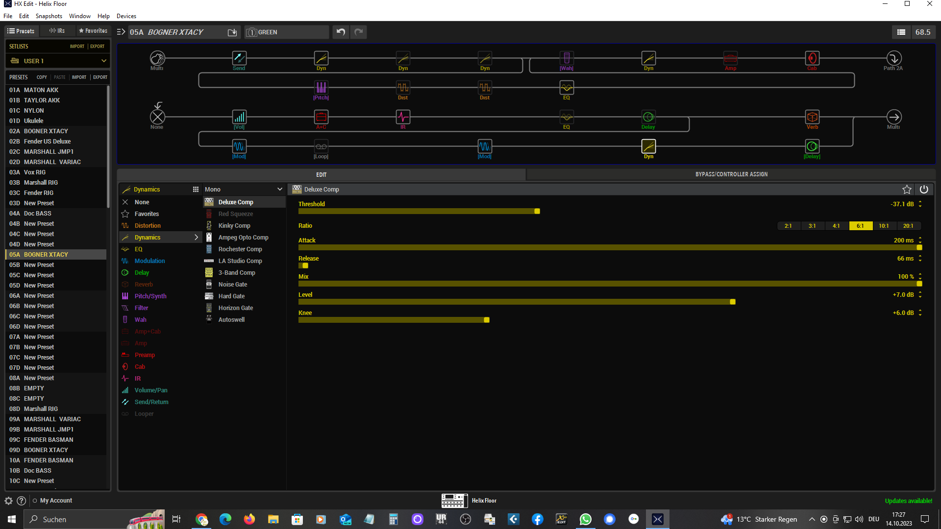 Da war doch noch was? Gerade habe ich meine Sachen gepackt für morgen. Ich wollte meinen Helix gerade abstecken und das Case schließen - da hat es in mir Klick gemacht. Da war doch noch was? Bei der Probe fiel mir auf, dass der Ton zu früh aufhörte zu klingen. Früher hat man sowas mit Sustain gelöst. Es gab auch mal extra Tonabnehmer, die nahezu endloses Sustain erzeugen. Aber ich spiele ja nicht "normal". Mein Helix ist ein sogenannter Modeller. Ein Gerät, das dem Mischpult vorgaukelt, es sei ein Verstärker. Eigentlich ein kleiner Computer, dessen Prozessor ganze Arbeit leistet. Mir gefällt meine Simulation eines Bogner Ecstasy supergut. Aber wie mache ich das nun mit dem Sustainer? Okay, da war doch was - ich habe doch mal gelesen, dass man den Effekt mit einem Kompressor erzeugen kann. Da der Helix mit dem PC verbunden ist, habe ich das innerhalb von ein paar Sekunden erledigt. Speichern und gut ist. Und damit ich morgen kein Fiasko erlebe: Zur Sicherheit die Bank kopieren, dann kann ich nicht versehentlich alles abschießen.